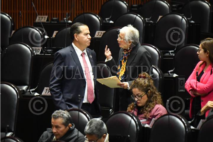 CIUDAD DE MÉXICO, 19MARZO2026.- Ricardo Mejía Berdeja, diputado del PT, y Olga Sánchez Cordero, diputada de Morena, durante la sesión semipresencial de la Cámara de Diputados en la que se presentó una ronda de iniciativas por parte de los grupos parlamentarios. FOTO: MARIO JASSO/CUARTOSCURO.COM