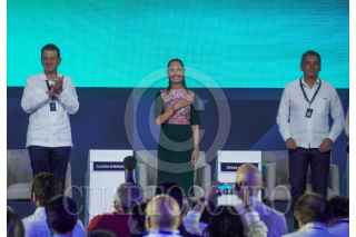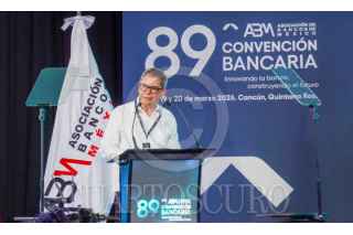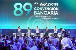 CANCÚN, QUINTANA ROO, 19MARZO2026.- Emilio Romano, presidente de la Asociación de Bancos de México; conversa con Claudia Sheinbaum Pardo, Presidenta de México, y Édgar Amador Zamora, secretario de Hacienda y Crédito Público (SHCP), durante la clausura de la 89 Convención Bancaria. FOTO: ELIZABETH RUIZ/CUARTOSCURO.COM