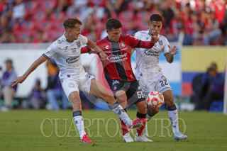 GUADALAJARA, JALISCO. 21MARZO2026- Alfonso González jugador de Atlas, disputa el balón con el contrario de Querétaro Carlo García, esto en partido correspondiente a la jornada 12 del Torneo Clausura 2026 de la Liga MX, en donde se enfrentan los equipos de Atlas vs Querétaro y en juego que se llevo a cabo en el Estadio Jalisco, el marcador al momento es de 0-0. FOTO: FERNANDO CARRANZA GARCIA / CUARTOSCURO.COM