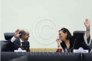 CIUDAD DE MÉXICO, 25MARZO2026.- Los consejeros electorales Jorge Montaño y Guadalupe Taddei conversaron durante la Sesión Ordinaria en el Instituto Nacional Electoral. FOTO: GRACIELA LÓPEZ/CUARTOSCURO.COM
