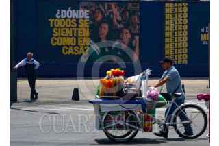 CIUDAD DE MÉXICO, 26MARZO2026.- Un vendedor de frituras empuja su triciclo, frente a una publicidad alusiva al Mundial de Futbol 2026 que se celebrara en nuestro país FOTO: ROGELIO MORALES/CUARTOSCURO.COM