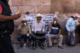 ZACATECAS, ZACATECAS, 27MARZO2026.- Productores de frijol mantienen un plantón en la Plaza de Armas del centro histórico. Después de medio día autoridades estatales y federales aceptaron una mesa de negociación para tratar de resolver la problemática del acopio y que los agricultores puedan entregar su semilla. El día de mañana en la plaza se inaugura el Festival Cultual de Zacatecas 2026, por lo que la presión de los frijoleros sentó a las autoridades después de 10 días de bloqueos y manifestaciones. A lo largo del día, colectivos y ciudadanos solidarios han llegado al lugar para entregar café , fruta, pan, comida y agua, por lo que los productores se han sentido respaldados. FOTO: ADOLFO VLADIMIR /CUARTOSCURO.COM
