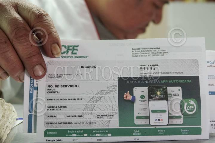 CIUDAD DE MÉXICO, 28MARZO2026.- Desde hace aproximadamente un año, una zona de la colonia Olivar de los Padres fue renombrada como “Lomas de San Ángel Inn”, un cambio que, de acuerdo con los vecinos, se realizó y fue impuesto sin previo aviso. Esta modificación ha traído consigo un incremento en los costos de servicios como el predial, el agua y la luz, afectando directamente a quienes han habitado el lugar durante décadas. El señor Ricardo, carnicero que lleva décadas en la colonia, muestra un recibo de luz en el que se evidencia el aumento en los costos de la luz, pasando de pagar alrededor de 800 pesos bimestrales a más de 6 mil. FOTO: CAMILA AYALA BENABIB / CUARTOSCURO.COM