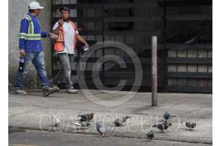 CIUDAD DE MÉXICO, 30MARZO2026.- Palomas se alimentan en una zona donde vecinos les han dejado semillas, en calles de la colonia Condesa, mientras al fondo un par de trabajadores conversan. FOTO: CAMILA AYALA BENABIB / CUARTOSCURO.COM