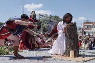CIUDAD DE MÉXICO, 03ABRIL2026.- Jesús es azotado como parte de la representación 183 de la Semana Santa en Iztapalapa, durante la escenificación del Viacrucis; celebración que a partir de este 2026 es considerada Patrimonio Cultural Inmaterial de la Humanidad. FOTO: CAMILA AYALA BENABIB / CUARTOSCURO.COM