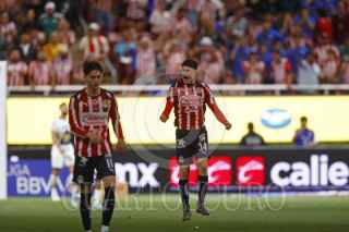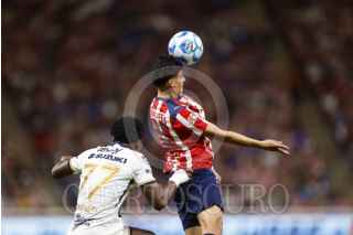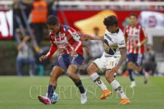 ZAPOPAN, JALISCO, 05ABRIL2026.- Luis Romo jugador de Chivas disputa el balón con el contrario de Pumas Robert Morales, esto en partido pendiente correspondiente a la jornada 13 del Torneo Clausura 2026 de la Liga MX, en donde se enfrentan los equipos de Chivas vs Pumas y en juego que se lleva a cabo en el Estadio Akron, el marcador al momento es de 2-0, a favor de Pumas. FOTO: FERNANDO CARRANZA GARCIA / CUARTOSCURO.COM