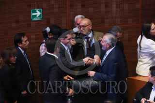 CIUDAD DE MÉXICO, 08ABRIL2026.- Roberto Velasco Álvarez, secretario de Relaciones Exteriores, saludó a Laura Itzel Castillo, presidenta de la mesa directiva en el Senado de la República, al término de la ratificación de su nuevo cargo en el pleno de esta dependencia. FOTO: GRACIELA LÓPEZ/CUARTOSCURO.COM