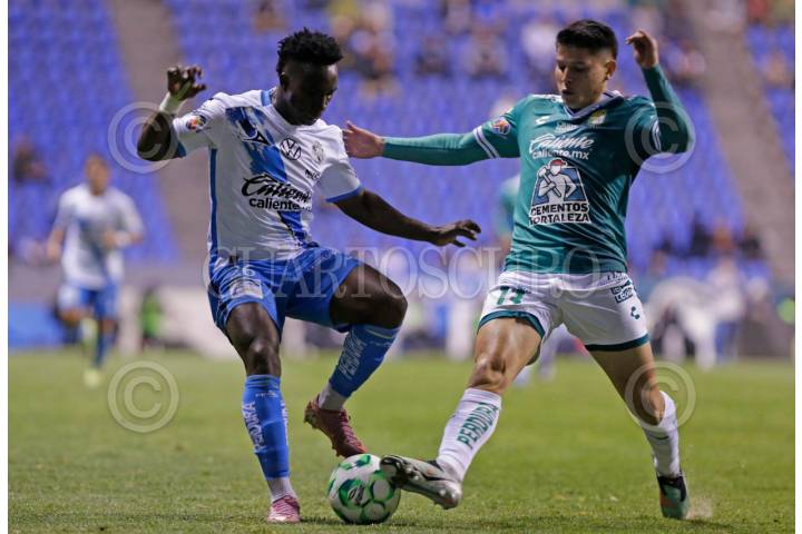 PUEBLA; PUEBLA; 10ABRIL2026.-Kevin Velasco y Daniel Arcila durante el partido entre el Club Puebla y los Esmeraldas de León; correspondiente a la jornada 14 del torneo Clausura 2026 de la Liga BBVA MX; celebrado en el estadio Cuauhtémoc. FOTO: MIREYA NOVO/CUARTOSCURO.COM