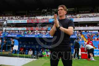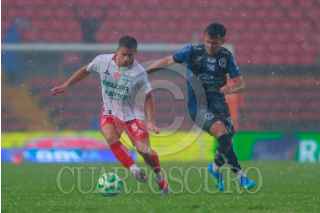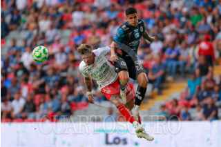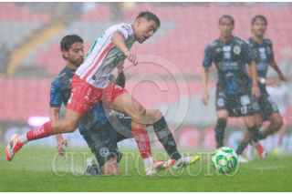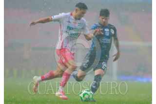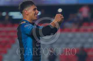 QUERÉTARO, QUERÉTARO, 11ABRIL2026.- Francisco Venegas del Queretaro y Ricardo Monreal del Necaxa durante el juego de la jornada 14 del Torneo Clausura 2026 de la Liga BBVA MX en el Estadio Corregidora. FOTO: CESAR GOMEZ/CUARTOSCURO.COM
