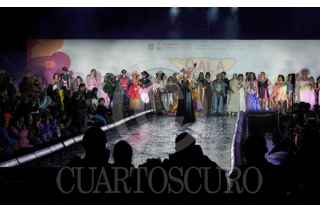 CIUDAD DE MÉXICO, 12ABRIL2026.- Bajo la lluvia se llevó a cabo el último desfile de la Gala Chilanga en el Monumento a la Revolución, donde desfilaron diversos vestuarios de diseño mexicano. La secretaria de Desarrollo Económico, Manola Zabalza, junto con otras autoridades, ofreció un mensaje de cierre. FOTO: CAMILA AYALA BENABIB / CUARTOSCURO.COM