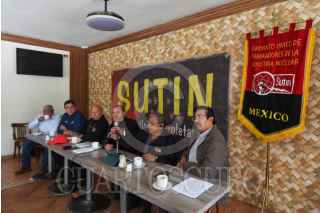 TOLUCA, ESTADO DE MÉXICO, 13ABRIL2026.- Integrantes del Sindicato Unico de Trabajadores de la Industria Nuclear en conferencia de prensa informaron que se encuentran en un período de revisión salarial con el Instituto Nacional de Investigaciones Nucleares, y emplazaron irse a huelga el próximo 30 de mayo de no llegar a algún acuerdo. FOTO: CRISANTA ESPINOSA AGUILAR/CUARTOSCURO.COM