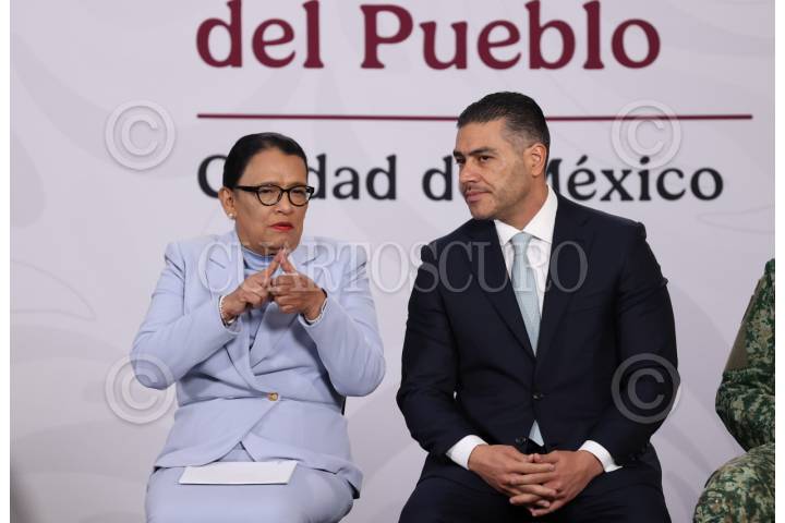 CIUDAD DE MÉXICO, 14ABRIL2026.- Rosa Icela Rodríguez , secretaria de Gobernación, y Omar García Harfuch, secretario de Seguridad Pública y Protección Ciudadana, durante la conferencia Mañanera del Pueblo, desde Palacio Nacional, en la que se ofreció el informe de seguridad, así cómo el anuncio de la Escuela de Mandos para la coordinación de la estrategia de seguridad en el país. FOTO: GALO CAÑAS/CUARTOSURO.COM