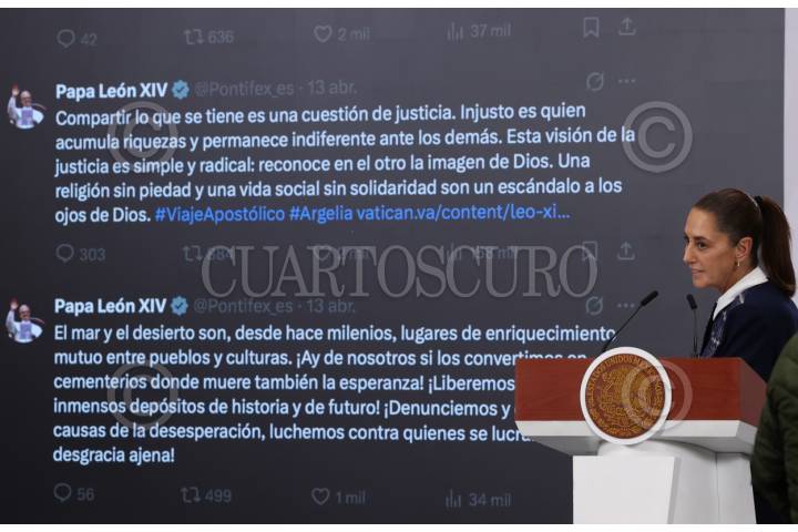 CIUDAD DE MÉXICO, 14ABRIL2026.- Claudia Sheinbaum Pardo, presidenta de México, muestra los tuits del Papá León XIV durante la conferencia Mañanera del Pueblo, desde Palacio Nacional, en la que se ofreció el informe de seguridad, así cómo el anuncio de la Escuela de Mandos para la coordinación de la estrategia de seguridad en el país. FOTO: GALO CAÑAS/CUARTOSURO.COM