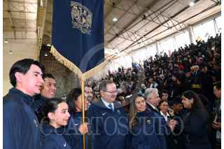 CIUDAD DE MÉXICO, 16ABRIL2026.- El rector Leonardo Lomelí Vanegas abanderó hoy a las escoltas de alumnas y alumnos deportistas que participarán en los Campeonatos Nacionales Universitarios, Olimpiada y Paralimpiada Nacional 2026, y los alentó a competir con honor, lealtad, deportivismo y juego limpio, así como defender los valores y colores de la Universidad Nacional Autónoma de México (UNAM). FOTO: UNAM/CUARTOSCURO.COM