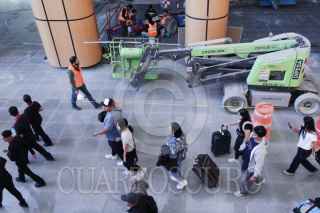 CIUDAD DE MÉXICO, 16ABRIL2026.- Continúan las obras de remodelación en el Aeropuerto Internacional de la Ciudad de México (AICM) rumbo al Mundial de 2026, lo que ha provocado que usuarios que transitan dentro de la terminal deban desplazarse por espacios reducidos que dificultan el paso. FOTO: CAMILA AYALA BENABIB / CUARTOSCURO.COM