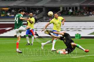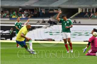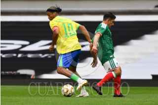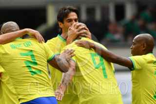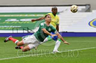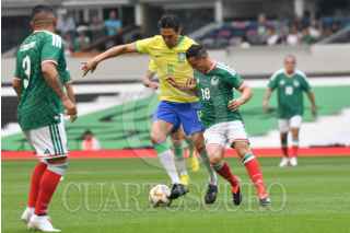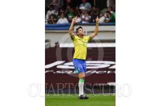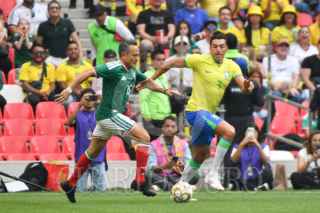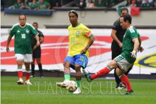CIUDAD DE MÉXICO, 19ABRIL2026.- Ronaldinho Gaucho (Brasil), y Gerardo Torrado (México) durante el "partido de leyendas" entre México y Brasil celebrado está tarde en el Estadio Banorte. Marcador final: Leyendas México (3) - (2) Leyendas Brasil. FOTO: MARIO JASSO/CUARTOSCURO.COM