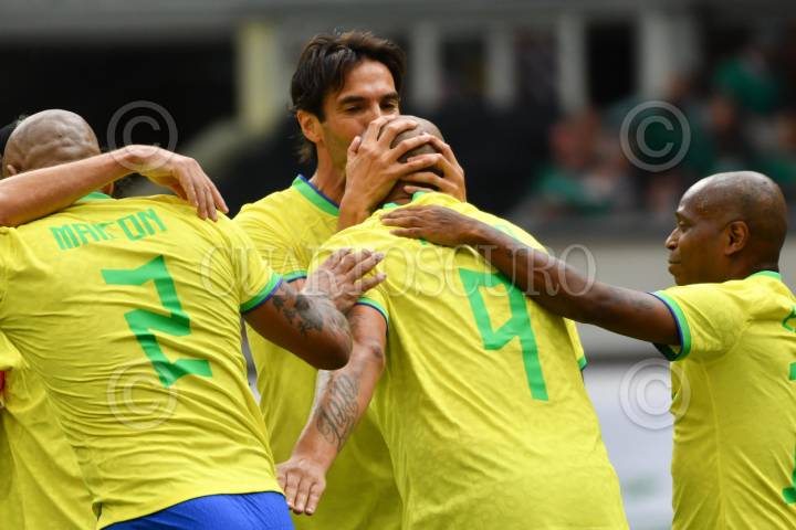 CIUDAD DE MÉXICO, 19ABRIL2026.- Kaká festeja la anotación de Adriano, durante el "partido de leyendas" entre México y Brasil celebrado está tarde en el Estadio Banorte. Marcador final: Leyendas México (3) - (2) Leyendas Brasil. FOTO: MARIO JASSO/CUARTOSCURO.COM