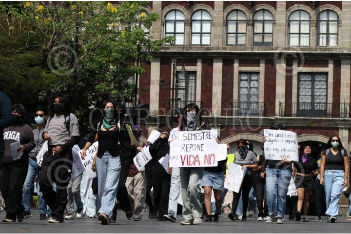CUERNAVACA, MORELOS, 20ABRIL2026.- Estudiantes de la Licenciatura en Seguridad Ciudadana y Ciencias Forenses de la Universidad Autónoma del Estado de Morelos marcharon esta mañana desde el monumento al Niño Artillero hasta el Palacio de Gobierno. Los estudiantes universitarios rechazan el Plan Integral de Seguridad Universitaria que presento el gobierno estatal el 9 de marzo y que las autoridades universitarias firmaron el 23 de marzo. Este plan proyecta instalar 9 módulos de seguridad con dos elementos de la Policía Industrial Bancaria y Auxiliar en el campus universitario y subsedes, 2 arcos de seguridad. También se proyecto la instalación de 20 postes de monitoreo inteligente con botón de pánico, y la colocación de 5 mil cámaras de videovigilancia en las instalaciones y alrededor de las universidades publicas. Esta propuesta de seguridad para la UAEM es rechazada por los estudiantes ya que argumentan que no fueron consultados para su elaboración. FOTO: MARGARITO PÉREZ RETANA/CUARTOSCURO.COM