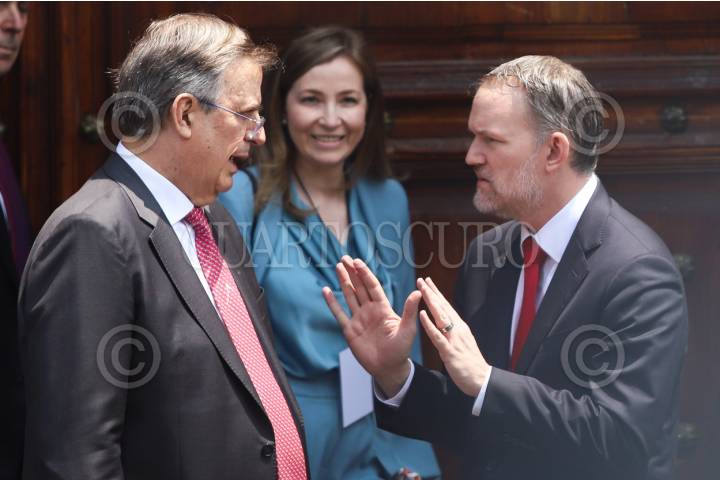 CIUDAD DE MÉXICO, 20ABRIL2026.- Marcelo Ebrard, secretario de Economía dialoga con el representante comercial de Estados Unidos, Jamieson Greer, luego de la reunión que sostuvieron en Palacio Nacional con la presidenta de México, Claudia Sheinbaum. FOTO: DANIEL AUGUSTO/ CUARTOSCURO.COM