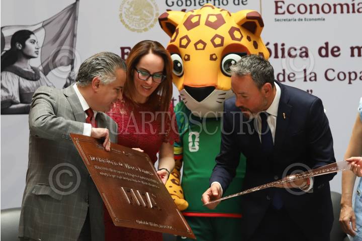 CIUDAD DE MÉXICO, 23ABRIL2026.- Santiago Nieto, titular del IMPI, le muestra las placas que hacen de la "FIFA" y "Trofeo de la Copa Mundial de la FIFA" marcas famosas, al director de la FIFA en México, Jurgen Mainka y a la representante del gobierno para la Copa del Mundo, Gabriela Cuevas. FOTO: DANIEL AUGUSTO/ CUARTOSCURO.COM