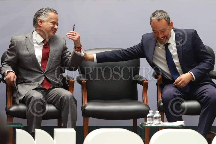 CIUDAD DE MÉXICO, 23ABRIL2026.- Jurgen Mainka, director de la FIFA México, le regala una pluma oficial de la Copa del Mundo al titular del IMPI, Santiago Nieto. FOTO: DANIEL AUGUSTO/ CUARTOSCURO.COM