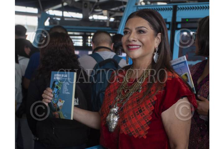 CIUDAD DE MÉXICO, 23ABRIL2026.- Clara Brugada, jefa de Gobierno de la Ciudad encabezo el arranque de la repartición de libros en el Cablebús que recorre la alcaldía de Iztapalapa. Este programa tiene el fin de que mientras los usuarios toman el cablebus puedan leer una lectura corta y regresarla al terminar su recorrido, esto como parte del marco del día del libro. FOTO: ANDREA MURCIA /CUARTOSCURO.COM