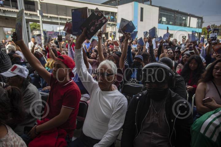 CIUDAD DE MÉXICO, 23ABRIL2026.- Clara Brugada, jefa de Gobierno de la Ciudad encabezo el arranque de la repartición de libros en el Cablebús que recorre la alcaldía de Iztapalapa. Este programa tiene el fin de que mientras los usuarios toman el cablebus puedan leer una lectura corta y regresarla al terminar su recorrido, esto como parte del marco del día del libro. FOTO: ANDREA MURCIA /CUARTOSCURO.COM