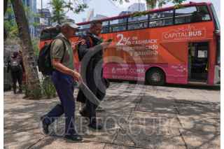 CIUDAD DE MÉXICO, 24ABRIL2026.- Un elemento de la Policía Bancaria e Industrial apoya a una persona con capacidad visual diferente a transitar por Paseo de la Reforma. FOTO: ROGELIO MORALES/CUARTOSCURO.COM