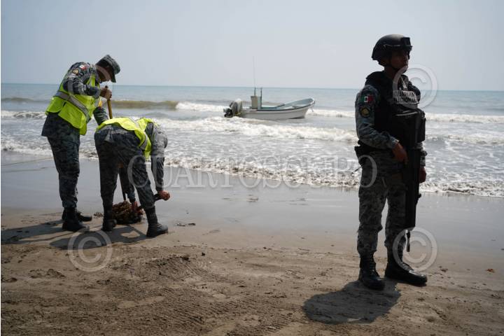 ALVARADO, VERACRUZ, 24ABRIL2026.- Elementos de la Guardia Nacional realizan labores de limpieza en una playa de la comunidad de Mata de Uva, municipio de Alvarado, donde han retirado restos de sargazo, hidrocarburo crudo, basura entre otras cosas. FOTO: VICTORIA RAZO/CUARTOSCURO. COM