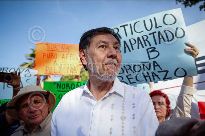 CULIACÁN, SINALOA, 24ABRIL2026.- Una asamblea informativa encabezado por la Senadora Imelda Castro y por el senador Gerardo Fernández Noroña en el parque La Alameda terminó en tensión y desorden tras la irrupción de más de 50 integrantes del colectivo “Guerreros Azules”, liderados por Yesenia Rojo Carrizosa. Los manifestantes, que llegaron desde colonias populares, lanzaron consignas contra el legislador, a quien acusaron de “misógino” y “rata”, mientras se registraban empujones y amenazas. El acto político fue cancelado de manera anticipada, y Noroña permaneció resguardado por simpatizantes que formaron un cerco para evitar el contacto directo con los inconformes, cerrando la jornada con un llamado a la unidad. FOTO: JOSÉ BETANZOS ZARATE/CUARTOSCURO.COM