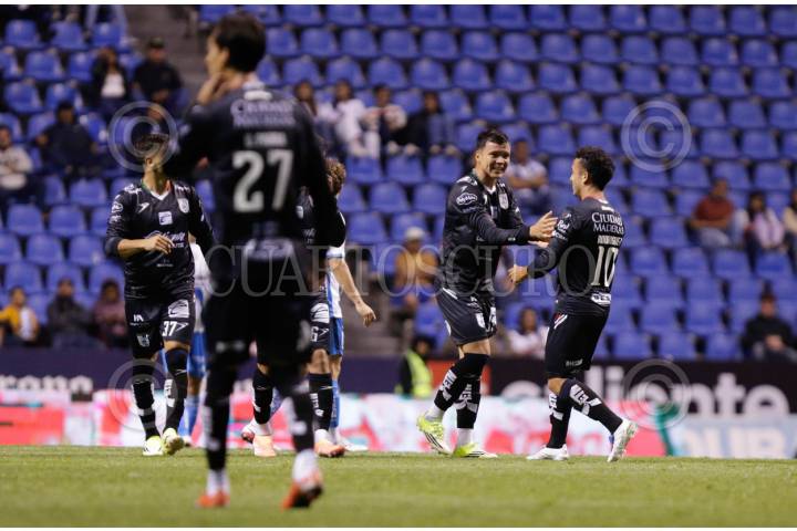 PUEBLA, PUEBLA, 24ABRIL2026.-Jugadores en festejo de gol durante el partido entre el Club Puebla y los Gallos Blancos del Querétaro, correspondiente a la jornada 17 del torneo Clausura 2026 de la Liga BBVA MX, celebrado en el estadio Cuauhtémoc. FOTO: MIREYA NOVO/ CUARTOSCURO.COM