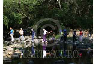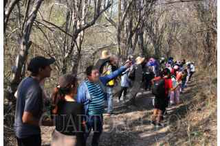XOCHITEPEC, MORELOS, 25ABRIL2026.- Un grupo de personas que participa en un recorrido por senderos interpretativos cruza el río Colotepec, cerca de la comunidad de Francisco Villa. El gobierno municipal ofrece estos recorridos, algunos mas desafiantes que otros, donde los visitantes pueden observar aves, peces, y conocer sobre algunas plantas medicinales que se van observando en el sendero. FOTO: MARGARITO PÉREZ RETANA/CUARTOSCURO.COM