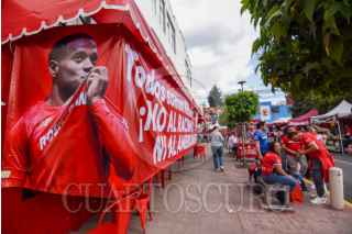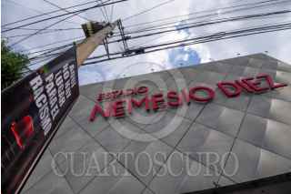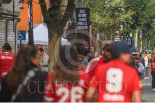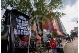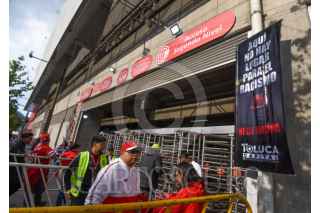 TOLUCA, ESTADO DE MÉXICO, 25ABRIL2026.- Previo al encuentro de los Diablos del Toluca ante la escuadra de León en las inmediaciones del estadio Nemesio Diez se observan lonas contra el racismo en respaldo a Helinho, jugador de la escuadra escarlata, después de los ataques sufridos por parte de aficionados americanistas. FOTO: CRISANTA ESPINOSA AGUILAR/CUARTOSCURO.COM