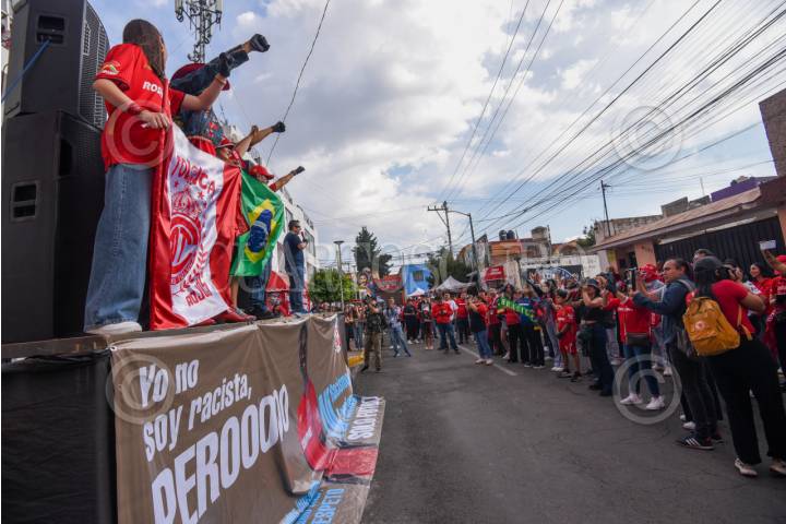 TOLUCA, ESTADO DE MÉXICO, 25ABRIL2026.- Seguidores de los Diablos del Toluca se reunieron en las inmediaciones del estadio Nemesio Diez en apoyo al jugador Helio Nunes conocido como Helinho, manifestando su rechazo al racismo portando un guante negro, esto después de los ataques racistas por parte de algunos aficionados. FOTO: CRISANTA ESPINOSA AGUILAR/CUARTOSCURO.COM