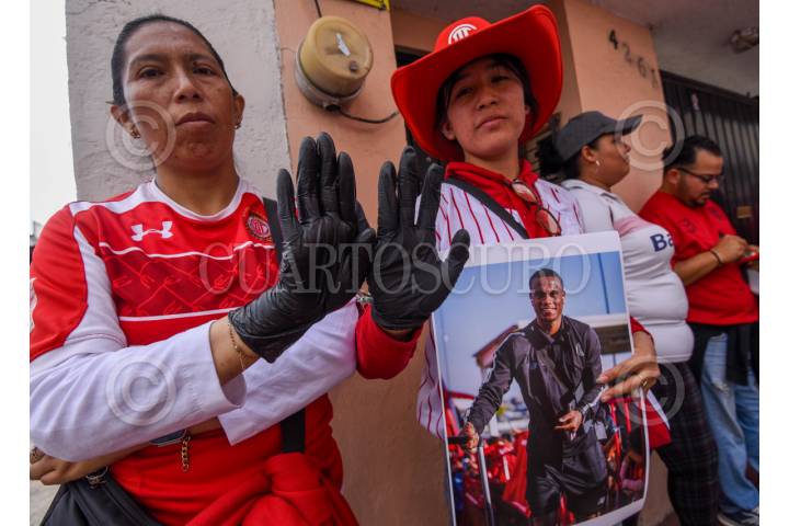 TOLUCA, ESTADO DE MÉXICO, 25ABRIL2026.- Seguidores de los Diablos del Toluca se reunieron en las inmediaciones del estadio Nemesio Diez en apoyo al jugador Helio Nunes conocido como Helinho, manifestando su rechazo al racismo portando un guante negro, esto después de los ataques racistas por parte de algunos aficionados. FOTO: CRISANTA ESPINOSA AGUILAR/CUARTOSCURO.COM