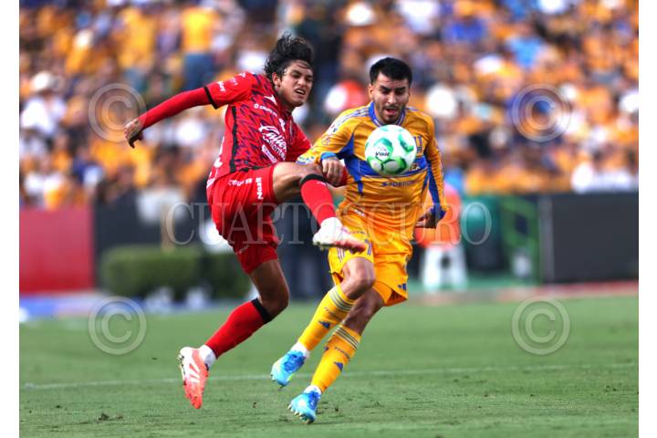 SAN NICOLÁS DE LOS GARZA, NUEVO LEÓN, 25ABRIL2026.- Ángel Correa de los Tigres, se disputa el balón con Alberto Herrera del Mazatlán, partido correspondiente a la jornada 17 de la Clausura 2026 d ella Liga Mx. Marcador Final: Tigres: 5 - Mazatlán: 1. FOTO: GABRIELA PÉREZ MONTIEL / CUARTOSCURO.COM