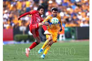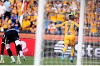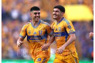 SAN NICOLÁS DE LOS GARZA, NUEVO LEÓN, 25ABRIL2026.- Juan Brunetta y Juan Purata de los Tigres, festejan el gol ante el Mazatlán, partido correspondiente a la jornada 17 de la Clausura 2026 d ella Liga Mx. Marcador Final: Tigres: 5 - Mazatlán: 1. FOTO: GABRIELA PÉREZ MONTIEL / CUARTOSCURO.COM