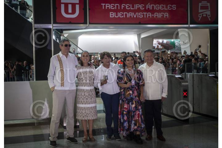 CIUDAD DE MÉXICO, 26ABRIL2026.- Jesús María Tarriba Unger, esposo de la Presidenta de México; Claudia Sheinbaum Pardo, Presidenta de México; Delfina Gómez, gobernadora del Estado de México; Clara Brugada Molina Jefa de Gobierno de la Ciudad de México, y Julio Menchaca Salazar, gobernador de Hidalgo, durante la inauguración del Tren Felipe Ángeles Buenavista-AIFA. Con este transporte los usuarios del Aeropuerto Internacional Felipe Ángeles harán solo 60 minutos desde la estación Buenavista, además de que por el momento solo costará 45 pesos. FOTO: ANDREA MURCIA /CUARTOSCURO.COM