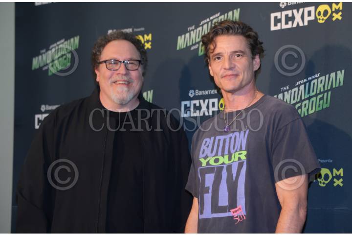 CIUDAD DE MÉXICO, 26ABRIL2026.- El director Jon Favreau y el actor Pedro Pascal durante el photocall de la película de Disney "The Mandalorian and Grogu", como parte de las actividades de la CCXPMX en su tercer día. FOTO: EDGAR NEGRETE LIRA/CUARTOSCURO.COM