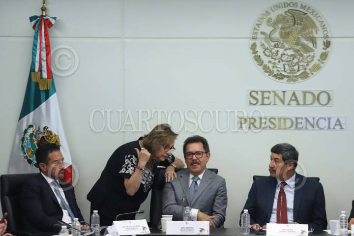 CIUDAD DE MÉXICO, 27ABRIL2026.- Los senadores Martha Lucía Micher e Ignacio Mier, conversaron durante la presentación y discusión del Plan Estratégico en materia de Justicia 2026-2030. FOTO: GRACIELA LÓPEZ/CUARTOSCURO.COM