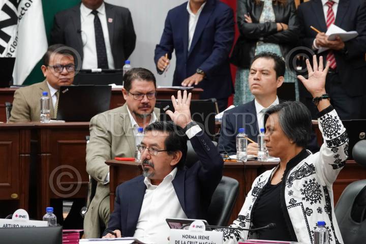 CIUDAD DE MÉXICO, 27ABRIL2026.- El recién nombrado consejero Arturo Manuel Chávez López y la consejera Norma Irene De La Cruz Magaña emiten su voto durante la sesión extraordinaria del Consejo General No. 19 del Instituto Nacional Electoral (INE). FOTO: CAMILA AYALA BENABIB / CUARTOSCURO.COM
