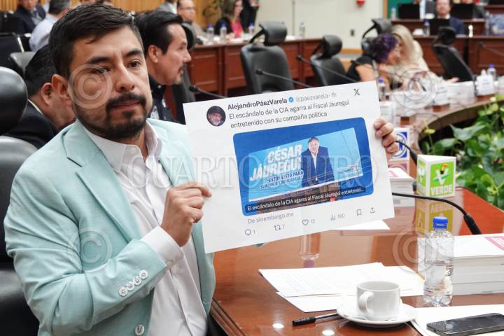 CIUDAD DE MÉXICO, 27ABRIL2026.- El diputado Guillermo Santiago Rodríguez, representante de Morena, durante su participación en la sesión extraordinaria del Consejo General No. 19 del Instituto Nacional Electoral (INE), muestra una imagen relacionada con el fiscal César Jáuregui, a quien acusa de estar ocupado mientras agentes de una nación extranjera operaban bajo su jurisdicción, nombrándolo como uno de los responsables de lo ocurrido en la Sierra Tarahumara y señalando que estaba empapelando Chihuahua con su propia imagen. FOTO: CAMILA AYALA BENABIB / CUARTOSCURO.COM