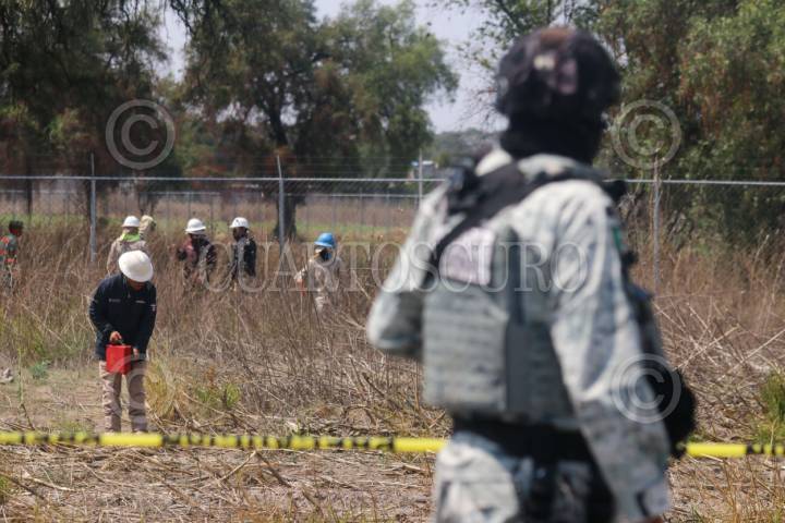 ACOLMAN, ESTADO DE MÉXICO, 27ABRIL2026.- Autoridades federales y estatales aseguraron una toma clandestina de hidrocarburo en los ejidos de Santa Catarina. Personal de Pemex se encuentra trabajando en luchar donde hallaron un túnel de aproximadamente 100 metros de largo que conectaba hasta un ducto de Pemex. Se presume que cuatro personas sin vida se encuentran al interior del túnel, quienes se pudieron intoxicar con los gases, sin embargo, los encargados del operativo no han confirmado este hecho. La zona se encuentra acordonada para evitar peligros a la población. FOTO: AXEL SÁNCHEZ/CUARTOSCURO.COM