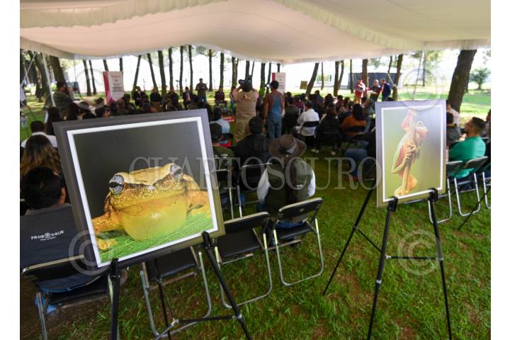 METEPEC, ESTADO DE MÉXICO, 28ABRIL2026.- Alejandro Santiago Sánchez Vélez, director de PROBOSQUE, Eduardo Rendón Salinas director del Programa de Ecosistemas Terrestres de WWF México, Leopoldo Islas Flores coordinador del Libro, José Arnulfo Silva Adaya, Secretario del Agua Edoméx, durante la presentación del libro Anfibios en Ecosistemas Forestales del Estado de México, en el marco del Día Internacional para la Conservación de los Anfibios. FOTO: CRISANTA ESPINOSA AGUILAR/CUARTOSCURO.COM