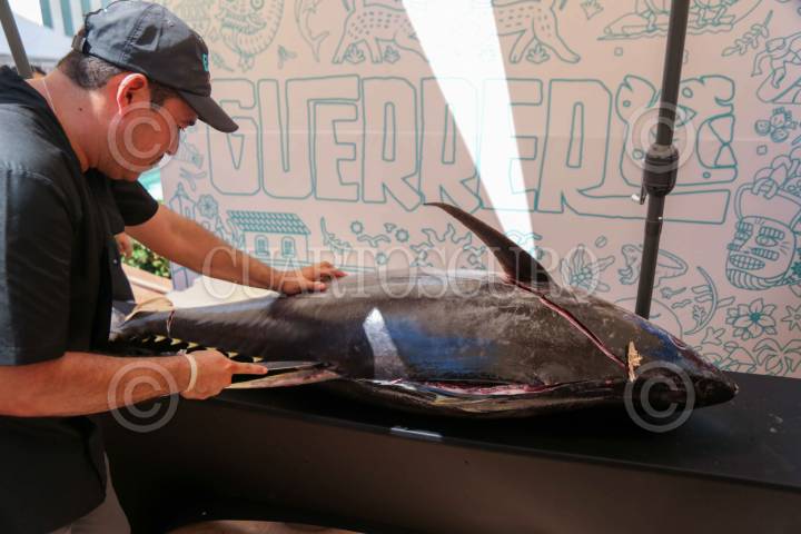 ACAPULCO, GUERRERO, 28ABRIL2026.- El ronqueo es un proceso que implica el despiece detallado de un pez atún para aprovechar al máximo su carne. El chef Daniel Sánchez realizó una demostración en el stand de Ixtapa Zihuatanejo en el Tianguis Turístico de Acapulco, lo que permitió a decenas de visitantes probar tostadas de sashimi en el corredor gastronómico Experiencia Guerrero. FOTO: CARLOS ALBERTO CARBAJAL/CUARTOSCURO.COM