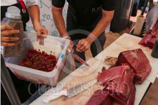 ACAPULCO, GUERRERO, 28ABRIL2026.- El ronqueo es un proceso que implica el despiece detallado de un pez atún para aprovechar al máximo su carne. El chef Daniel Sánchez realizó una demostración en el stand de Ixtapa Zihuatanejo en el Tianguis Turístico de Acapulco, lo que permitió a decenas de visitantes probar tostadas de sashimi en el corredor gastronómico Experiencia Guerrero. FOTO: CARLOS ALBERTO CARBAJAL/CUARTOSCURO.COM