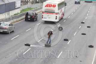 MÉXICO, D.F., 04JULIO2014.- Granaderos de la SSP-DF dispersan a un pequeño grupo de manifestantes que intentaron cerrar con piedras y llantas los carriles centrales de la calzada Zaragoza para protestar contra la nueva disposición de la Secretaria del Medio Ambiente del programa “Hoy No Circula”. FOTO: SAÚL LÓPEZ /CUARTOSCURO.COM