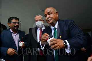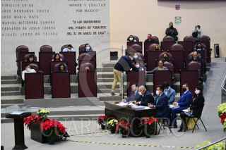 XALAPA, VERACRUZ, 18NOVIEMBRE2020.- Eric Cisneros Burgos, secretario de Gobierno, compareció ante el Cogreso como parte de la glosa del Segundo Informe de Resultados en Veracruz escoltado por 76 munícipes de las diferentes fuerzas políticas que acudieron a respaldarlo. Fue denunciado ante la FGR por alcaldes de la oposición por amenazas. FOTO: YERANIA ROLÓN /CUARTOSCURO.COM