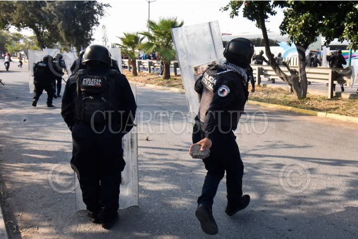 CHILPANCINGO, GUERRERO, 19ABRIL2023.- Policías del estado de Guerrero, con equipo antimotín, repliegan y evitan bloqueo en la autopista del Sol por parte de los estudiantes de la Escuela Normal Rural "Raúl Isidro Burgos’" de Ayotzinapa, hubo intercambio de pedradas, lanzamiento de petardos y de gas lacrimógeno, no se reportan lesionados graves. FOTO: DASSAEV TÉLLEZ ADAME/CUARTOSCURO.COM